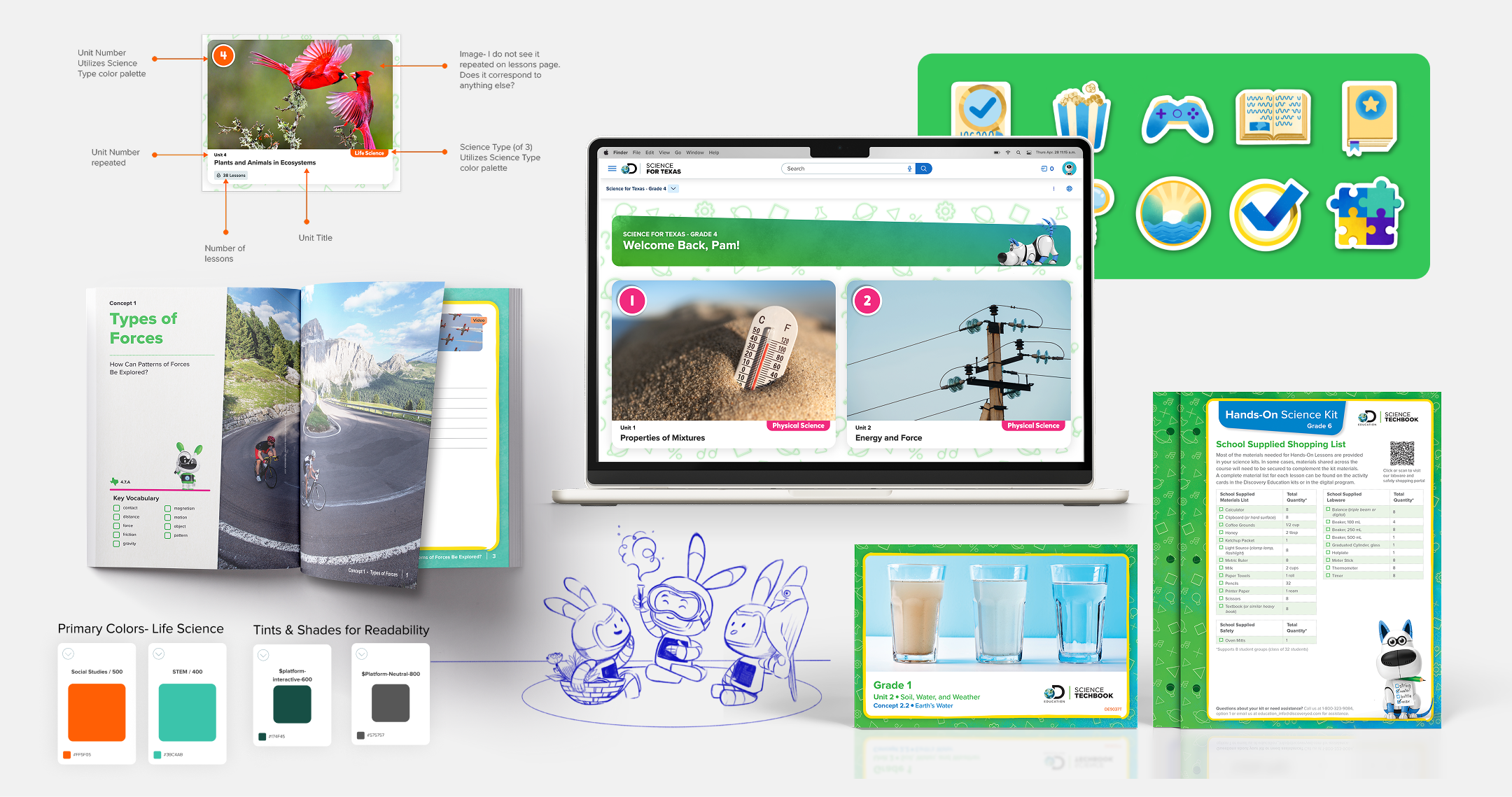 I led the design strategy for Science Techbook, one of Discovery Education’s flagship products, supporting its successful adoption across major markets including Texas and Florida. Beginning with a deep analysis of the existing information architecture, I restructured the experience to improve clarity, scalability, and usability across complex educational requirements. I developed flexible design systems and repeatable patterns to address challenges such as grade-band differentiation and clearly communicating pedagogy to diverse stakeholders. Science Techbook represents a significant portion of Discovery Education’s business, contributing approximately $100M annually.